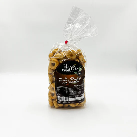 I tarallini pugliesi alle olive nere sono snack croccanti tipici della Puglia. Preparati con una base di farina, olio d’oliva, vino bianco e sale, vengono arricchiti da olive nere tritate, che conferiscono un sapore intenso e aromatico. La loro forma è a piccolo anello, e la consistenza è leggera e friabile. Ideali come aperitivo o per uno spuntino, i tarallini alle olive nere sono un piacere semplice ma gustoso, che racchiude il sapore della tradizione pugliese.